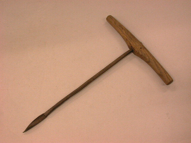 - BeschrijvingGedraaid lepelblad (de punt is afgebroken) die is aangezet aan een iets geknikte steel. Hierop staat een onleesbaar stempel. De steel eindigt in een angel die door het handvat is gestoken en verankerd is met een moer.