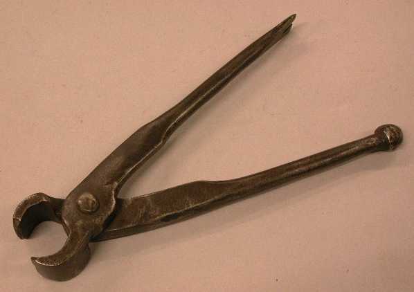 - BeschrijvingGesmeedde nijptang (brede bek) met stevige stelen, waarvan één knopvormig uiteinde heeft en de ander een klauwvormig uiteinde (om het hout rond een diepliggende spijker te verwijderen zodat deze vrij komt te liggen). Beschadigd aan de bek.