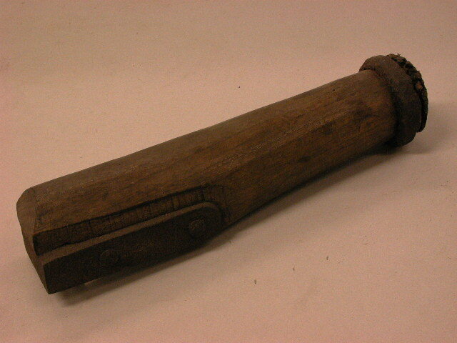- BeschrijvingHouten werktuig met een rond uiteinde (voorzien van ijzeren ring) en een plat uiteinde (voorzien van een stevige, hoekige ijzeren band die om de top van het hout heen is genageld). Waarschijnlijk om een hoepel om een ton te slaan (in combinatie met een hamer).