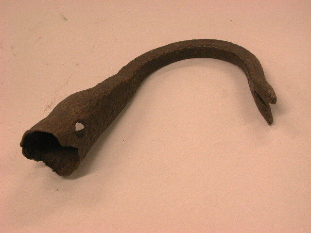 - BeschrijvingHuls met sterk gebogen steel en vorkvormig uiteinde. Om ranken van doornstruiken te kunnen plukken.