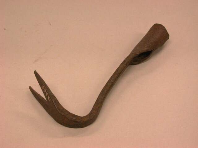 - BeschrijvingHuls met sterk gebogen steel en vorkvormig uiteinde (ooit hersteld bij de kromming van de steel). Om ranken van doornstruiken te kunnen plukken.