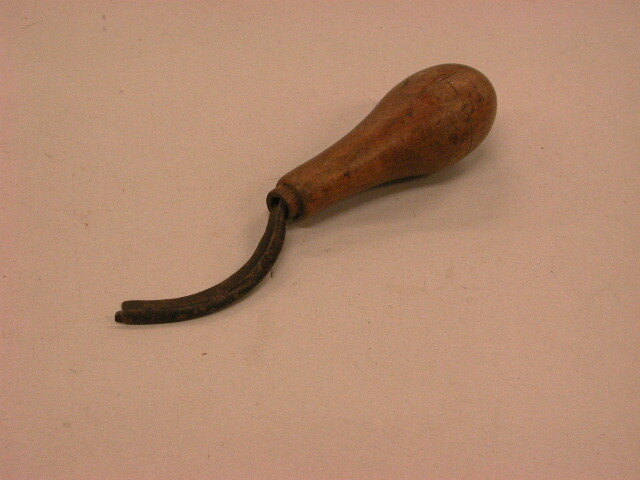 - BeschrijvingIJzeren stokje met geprofileerde bovenzijde op één zijde staat gestempeld: 11,?/koningskroon/GSV/B. Gedraaid houten handvat met kerfversiering, koperen beslagring en ophangleertje.