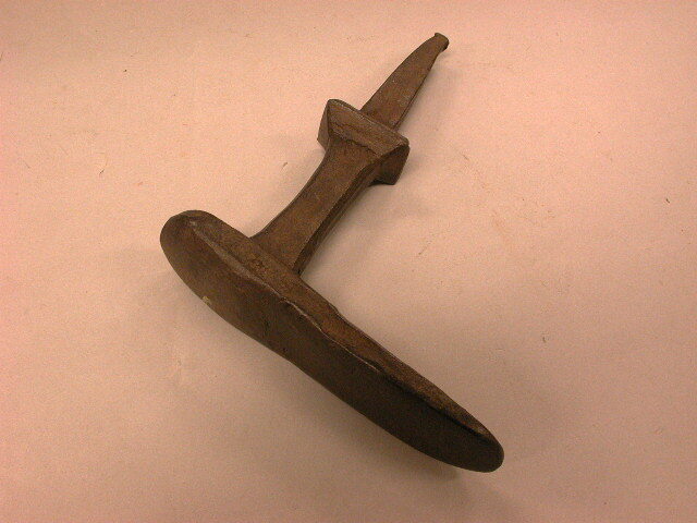 - BeschrijvingUit enkele stukken aan elkaar gesmeed. Hoekig onderstuk voor houtblok/bok (de verdikking erboven voorkomt het steeds dieper wegzakken van de ijzeren leest in het hout).