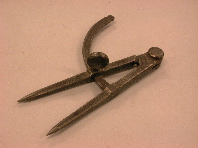 - DescriptionPasser met rechte hoekige, scharnierende, spitse poten. Een poot is voorzien van een huis met schroefveer, de ander van een ¼ cirkel boogstuk die door het huis hun omhoog steekt en die voorzien is van een sierende contour aan de top.