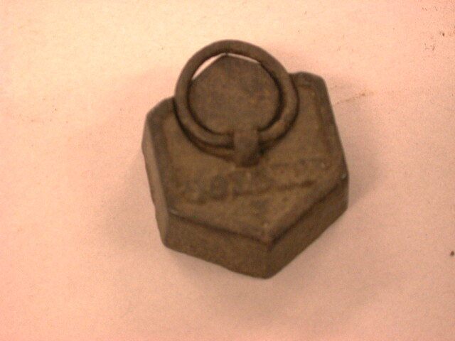 - BeschrijvingZeshoekig ringgewicht van 0,1 kg met losse (beweegbare) ring. Bovenzijde is met lood gevuld (verzwaard) en voorzien van gewichtsaanduiding '1/' HECTOG'. Aan onderzijde een hoekig ijkgat dat met lood gevuld is en waar de ijktekens 6.D, een kroon en de initialen G.G. of G.C. zijn gestempeld.