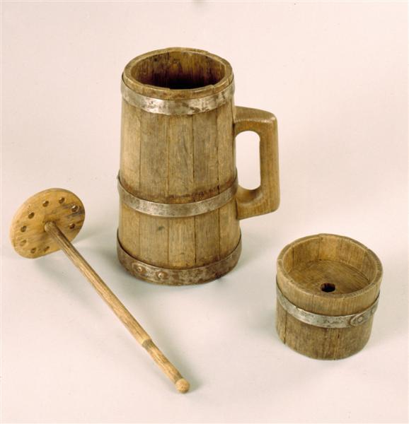 Eikenhouten karnton of stande. Conische ton: even lange, rechte duigen, waarvan er één voorzien is van een groot houten handvat, ongeveer halverwege de lengte drie ijzeren banden en een verhoogde bodem. De stamper heeft een ronde steel, handvatuisparing met kropvormig uiteinde druif en een platte schijf met gaten(cirkelvorm). De schede heeft duigen met ijzeren band en een dekselplaat (met gat voor de stamper).