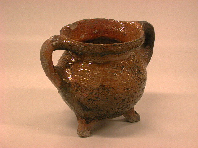 Bolle bodem. Drie standpootjes met klauwvoet. Bolvormige buik, overdekt met fijne dramringen, met name aan bovenzijde. Zich licht verwijdende, opstaande rand en schouder. Rode scherf. Loodglazuur aan binnenzijde, behalve net onder rand, en buitenzijde behalve oren en bodem met pootjes. Zwartgeblakerd.