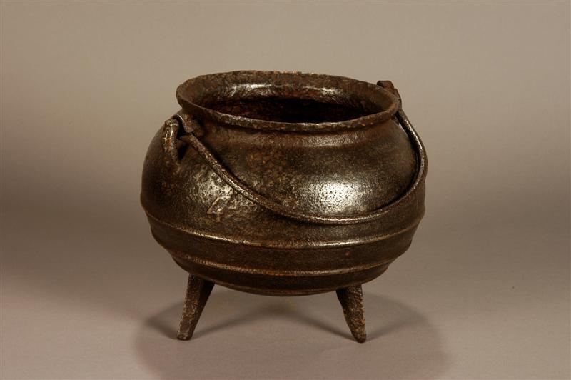 - BeschrijvingDriebenige ijzeren kogelpot. Decoratie: 3 evenwijdige korte pootjes reliƫfrandjes vanaf het opstaande boord, midden van de pot naar staande, rechthoekige oren, met hengsel.