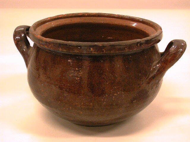 - BeschrijvingPlatte bodem. Zich convex-konisch verwijdend en naar rand toe weer vernauwend lichaam. Hoekige uitstaande rand met dekselgeul aan binnenzijde. Twee horizontale opwaartse gerichte bandoren op lichaam. Rode scherp donkerbruin loodglazuuur aan buitenzijde, oranjebruin met groene plekken aan binnenzijde.