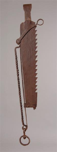 - BeschrijvingZaaghaal met steunstang. Wartel. Glijstang met een parabel lopende, getordeerde steuntang. Zaagdeel (met ketelhaak), rijkelijk versierd met gegraveerde motieven sterren, gecompliceerde vierkanten en rechthoeken, een levensbom, IHS monogram in spiegelbeeld. Stelhaak.