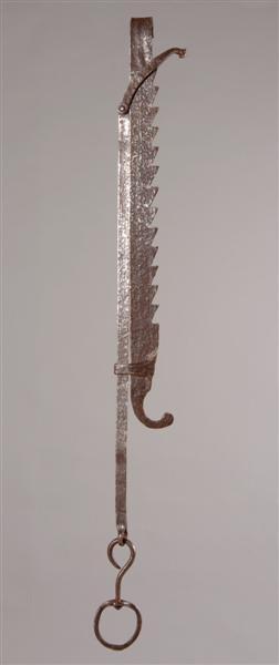 - BeschrijvingZaaghaal (bekroond met een krul). Wartel. Glijstang. Zaagdeel (bekroond met uitgesneden krul) met ketelhaak. Stelhaak.