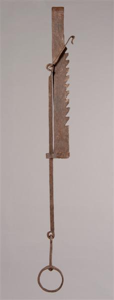 - BeschrijvingZaaghaal bestaande uit 5 scharnierende delen. Wartel (scharnierend ophangoog), glijstang. Zaagdeel met ketelhaak voorzien van bandversiering. Twee evenwijdige lijnen met daartussen kartellijn. Stelhaak.