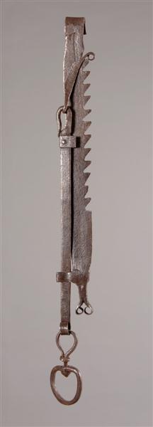 - BeschrijvingZaaghaal bekroond met ingekapt kruis en 13 tanden. Met wartel en glijstang. Zaagdeel met ketelhaak bekroond met ingekapt kruis. Stelhaak.
