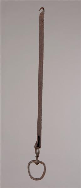 - BeschrijvingFragment van een zaaghaal, nl. glijstang met aan de onderkant een krulvormige haak. Aan de bovenkant voorzien van een wortel.