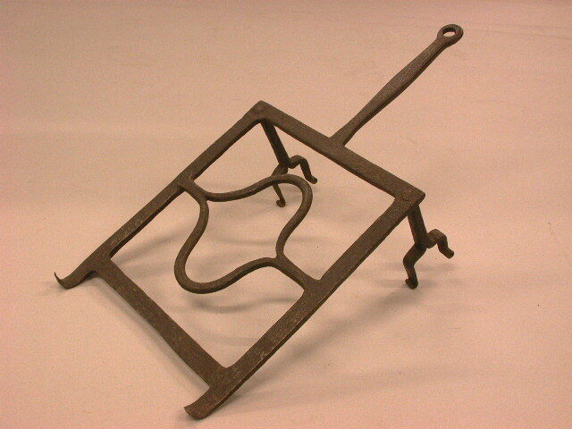 - BeschrijvingVierkant braadrooster met maar 2 poten (n.l. aan de kant van de steel) de andere zijde moet kennelijk rusten op een brandijzer. Steel met een oogje.