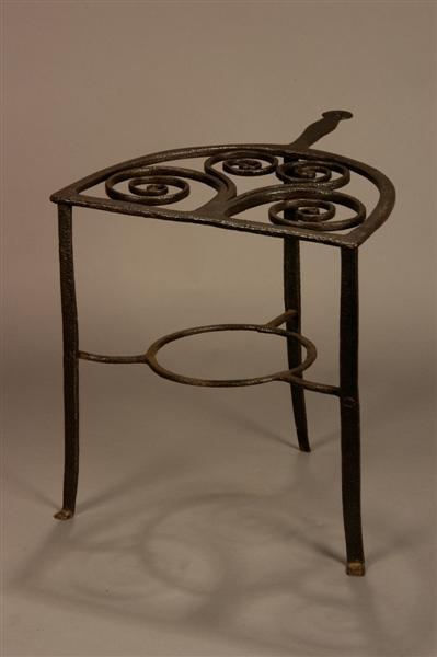 - BeschrijvingHalfrond model ijzeren komfoor met lange poten, waarvan de 2 aan de andere zijde zijn omgebruikt. De poten worden halverwege met elkaar verbonden door een ring, waarop een vuurtest geplaatst kan worden. Bovenkant is een rooster van krullen.