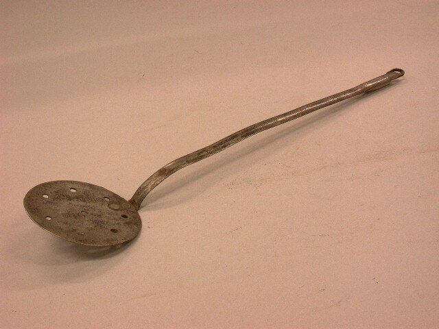 - BeschrijvingIJzeren schuimspaan. Ronde bak, geperforeerd in een concentrische cirkel. Platte,scheefgebogen steel met een ophangoog aan het uiteinde.