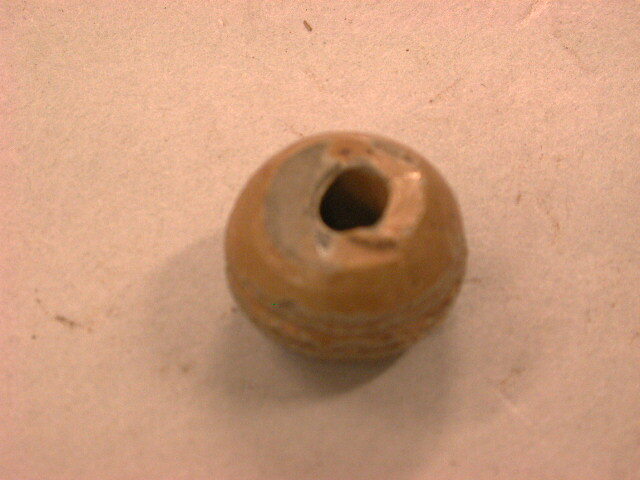 Kraalvormige spinsteen met rondom cirkelvorming ersiering. Grijze scherf met bruine glazuur. De steen is met zwarte inkt gemerkt: D4 NL