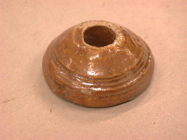 Paddelstoelvormige spinsteen met kerfversiering. Grijze scherf met bruine glazuur.
