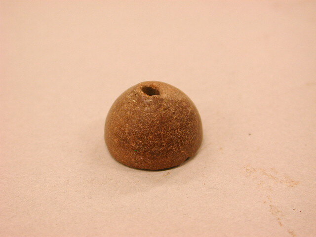 Paddestoelvormige, roodachtige spinsteen met heel klein gat, gemerkt met zwarte inkt: M3.