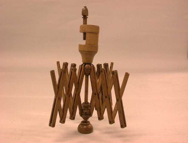 - BeschrijvingHouten kluwenwinder met tafelklem -tafelklem met ingedraaide schroef -de tafelklem geeft steun (dicht als voet voor) en ijzeren pin: de as. Om de as zit de molen: harmonica-armen die tevens scharnieren aan de top en de trommel.
