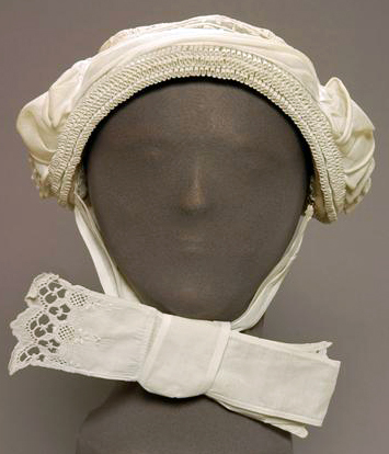 Wit mutsje van neteldoek. Langs de voorkant drie geplooide strookjes grof neteldoek. Pas (met drie koppeltjes) en bodem van genopt neteldoek. Entre-deux in de bodem van broderie-anglaise. Achterstrook (luifke) van grof geplooid neteldoek met twee koppeltjes en een aangezet machinaal kantje. Over de voorstroken en versiering van neteldoek met gerolde randen (aan de zijkanten in lussen gelegd en met geplooide strookjes versierd). Middenachter een strik en korte afhangende lintjes van gerold neteldoek. Langs de lintjes een tulen kantje. Kinstrikken van gesteven neteldoek met aan de uiteinden broderie-anglaise. Muts verstevigd met een band van gevlochten stro (en laiton?).