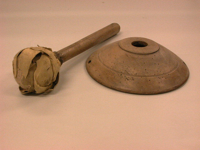 - BeschrijvingBeukenhouten zuurkoolstamper Korte dikke steel met aan bovenuiteinde een oog (ophangoog) en aan de onderzijde een bol Bekleed/van stof en zeemleer.