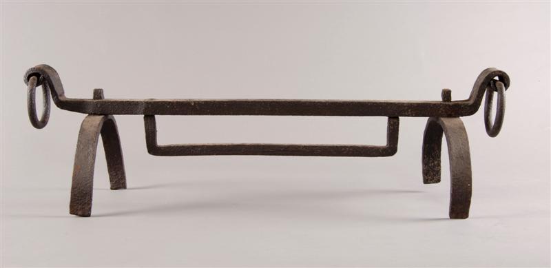 - BeschrijvingVuurijzer bestaande uit een ijzeren staaf met onder elk uiteinde een gebogen ijzeren staaf als voet. Boven op de uiteinden zijn scharnierende ringen bevestigd. Onder aan de lange staaf zit een beugel