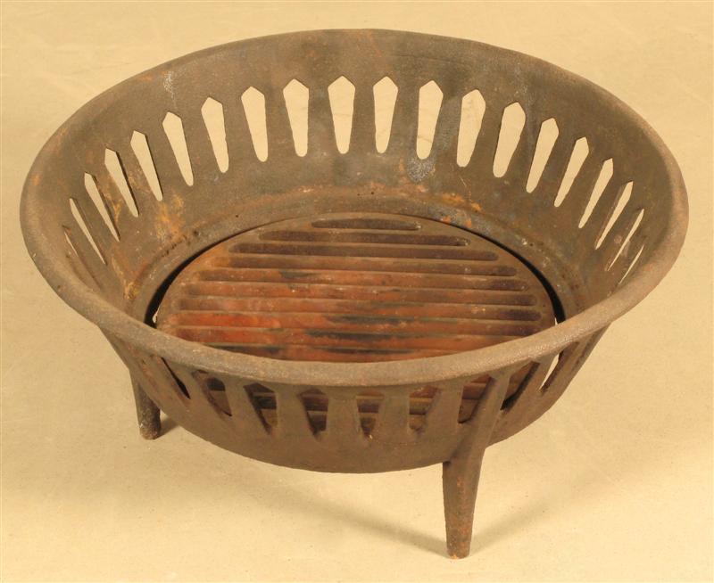 - BeschrijvingRond brandijzer op 3 poten en een los rooster als bodem.