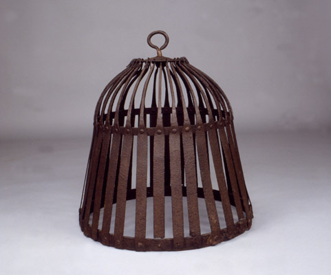 - BeschrijvingIJzeren vuurstolp. Ronde bovenplaat met scharnierend ophangoog. Verticale spijlen lopen door bovenplaat heen (lus naar buiten) en zijn vastgeklonken aan twee hoepels.