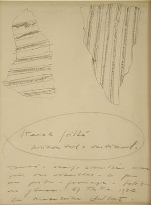 - BeschrijvingGeannoteerd m.o.: steack grillé/horizontaal en verticaal. (daaronder een frans recept - voor het grootste deel onleesbaar - 57. Fr. Fr. 1980 ...) Verso: ik houd mijzelf bezig met het aan elkaar afmeten van verschillende structuren.