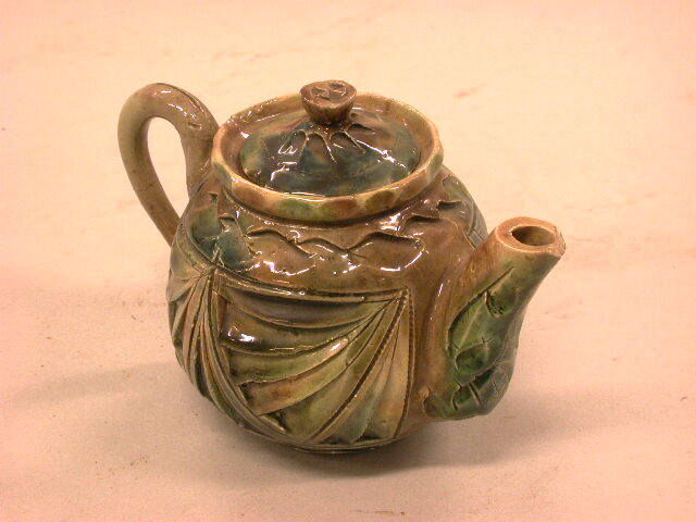 - TitelSpeelgoed theepotje met polychroom gevlamd glazuur en kerfsneeversiering