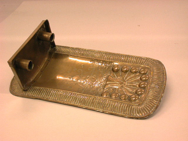 - BeschrijvingRechthoekige wandplaat met haaks daarop bevestigde rechthoekige vetvanger waarin twee hulzen zijn aangebracht. Wandplaat en kaarsenhouder zijn gedecoreerd met geponste stempelversieringen.