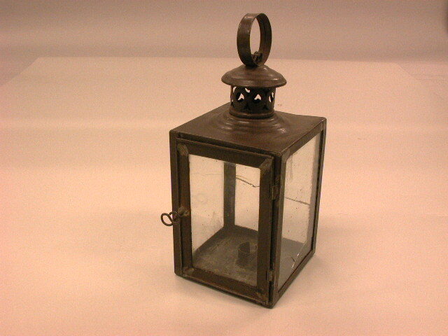 - BeschrijvingKaarslantaarn: metalen corpus met glazen ruitjes -Rechthoekige kastje met een huls op de bodem -Decoratief opengewerkte deksel t.b.v. de luchttoevoer -Ophanging