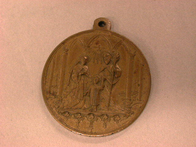 Medaille van Aartsbroederschap der H. Familie (1845 bisschoppelijke, 1847 pauselijke goedkeuring) met oogje. Voorzijde Jezus als kleine jongen onder H.Geest in vorm van stralende duif, tussen Maria in sterrenmantel en Jozef met bloeiende staf, alle drie staande op door drie passen geschraagd plankier, waarachter balustrade, versierd met florale elementen en kruizen. Geheel onder gotisch baldakijn. Geprofileerde rand. Keerzijde: bloem met puntige bladeren, waarop geruite driepassen en waartussen krulornamentjes. Hart onbegrensd door parelrand. Grotere parelrand om hele bloem. Omschrift: "AARTSBROEDERSCHAP DER HEILIGE FAMILIE", cirkel met aan weerszijden franse lelie geprofileerde rand.
