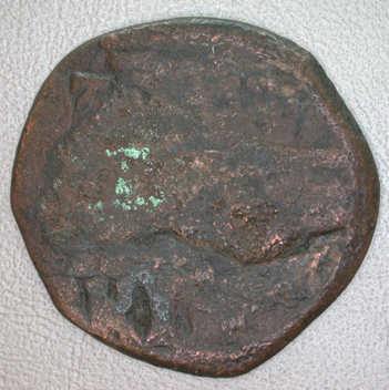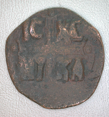 - BeschrijvingVoorzijde: Vrouwenkopje 'en profil' naar rechts Daaromheen het omschrift. Keerzijde: Staande figuur met een speer in de linker- en een (wereld) bol in de rechterhand.