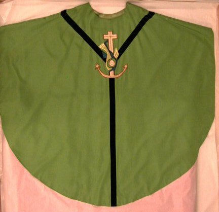 Groen kazuifel in gothisch model. Groene ribstof van viscoserayon gevoerd met groene viscoserayon in keperbinding. Op voor- en achterzijde een gaffelkruis van zwart fluweel (rayon). Op de achterzijde een applicatie in verschillende stoffen, waarop borduurwerk. Voorstelling: anker met vis. Op het anker en de vis is goudkoord genaaid.