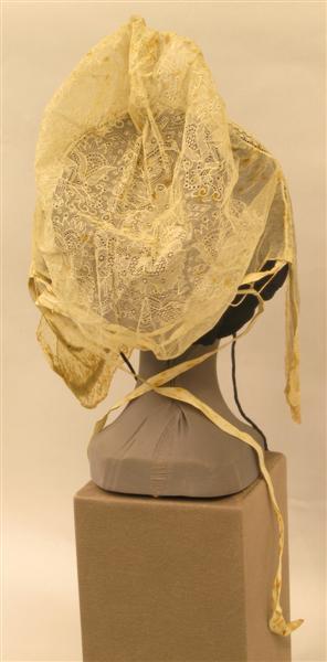 Witte katoenen trekmuts/spanmuts. Bodem van witte katoenen tule met doorstopwerk, eenbloemig patroon. Aan de voorkant in de bodem aan een smal machinaal kantje de pas gezet. Boven op het hoofd is de bodem gerimpeld. Langs de onderkant zijn van dik garen lussen genaaid. Door de lussen zijn 2 katoenen banden geschoven. De voorstrook bestaat uit neteldoek en 2 stroken machinale kant. De breedte van de strook (neteldoek, waarlangs een strook kant) loopt 8.5 cm van boven op het hoofd uit tot 24 cm ter hoogte van de kin. Op het neteldoek is langs de daar reeds aangenaaide kant de tweede strook zelfde kant genaaid. De hele voorstrook is zeer hard gesteven en fijn geplooid (waarschijnlijk met het plooiplankje). Langs de voorkant is door de plooitjes een katoenen draad geregen. Op de beide randen van de 2e kant zijn fantasiebandjes genaaid: een smal aan de achterkant en een breder aan de voorkant. Langs de pas is ter hoogte van het linkeroor een rood draadje ingenaaid.