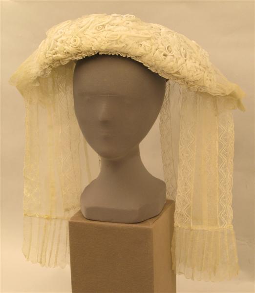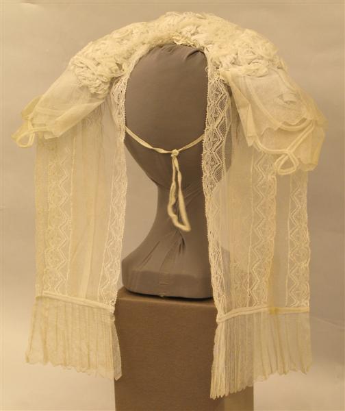 Kleine poffer. Werd gedragen op muts door mevrouw M.E. van de Ven-Olislagers, in de week (naar de kerk, bij visites e.d.). Romp van sterk gesteven, grof geweven gaas, verstevigd met dik laiton. Op de romp 'bloemen' van gerold gaas en lussen van in smalle repen geknipt gaas. Langs de lange repen geknipt gaas. Langs de lange zijden van de romp een geplooid machinaal kantje. Over de versierde romp een netje van katoenen tule. Strikken van tule, aan beide zijden afgezet met tulen kant. Onderaan de strikken geplooide stroken tule, aan de bovenkant afgewerkt met een dubbel gerold randje tule, aan de onderkant in schelpjes geknipt. Bovenop de strikken een geschulpte 'zig-zag' gelegde strook tule. Tussen deze stroken lussen van dubbel gerolde stroken tule. Op de onderkant van de romp is een elastiekje bevestigd.