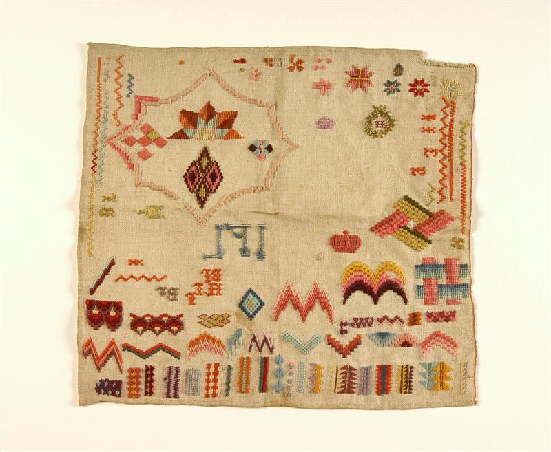 - BeschrijvingOngebleekte katoenen lap. Borduurwerk in verschillende kleuren wol. Geborduurd in platte steken en kruissteken. Allerhande patroontjes. Letters: meerdere malen BL, JLF, J, C, eenmaal L, verspreid over de hele lap