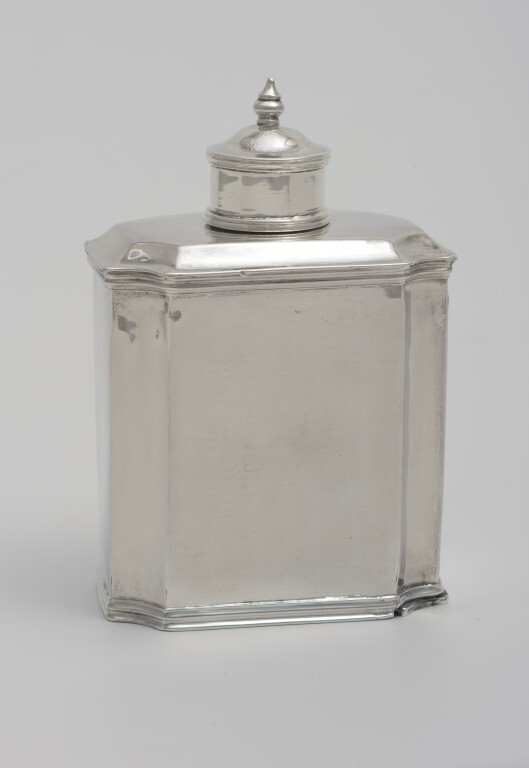 Theedoos van zwart gelakt eikenhout met uitschuifbare bodem. Rechthoekig op vier bolpootjes met klauwen. Gegolfde opbouw. Beslag en hengsel van zilver. Aan binnenzijde drie theebusjes, elk rechthoekig met parelrand. De busjes links en rechts hebben een cirkelvormige opening afgedekt door een knop met daarop een bloemenbos.