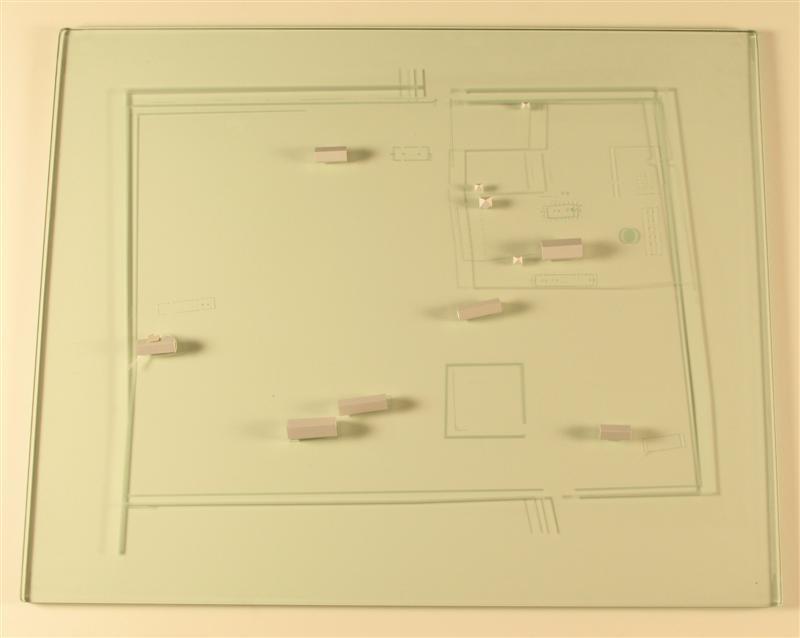 Bestaande uit een geëtste glazen plaat, met daarop kunststof opstallen. Het gaat hier om een belangrijke nederzetting, omgreppeld en met tweemaal zoveel huizen als de omliggende dorpen. De geëtste plattegrond aan de onderzijde van de glasplaat geeft de situatie in de eerste eeuw weer. Het dorp bezat toen behalve boerderijen, schuren en waterputten ook een heiligdom met greppels en totems.