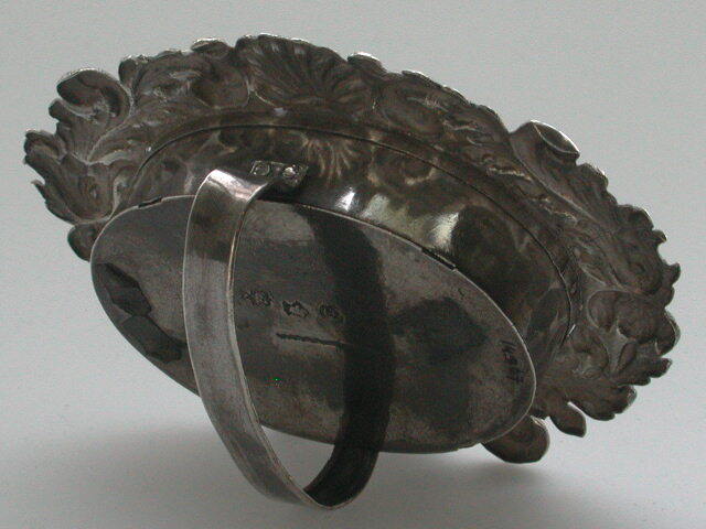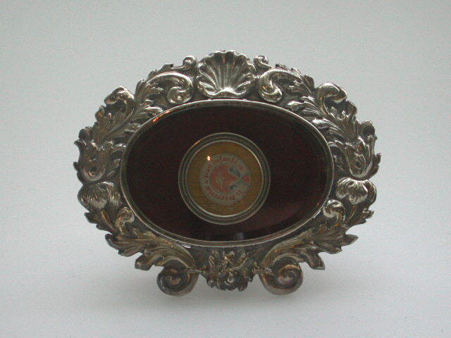 - BeschrijvingOvale reliekhouder met geslepen glas in de voorzijde, omzoomd door een brede rand van gedreven acanthusbladeren, waartussen aan de bovenzijde een Jacobusschelp. Aan de achterzijde een beugel om de houder op de hand te dragen.