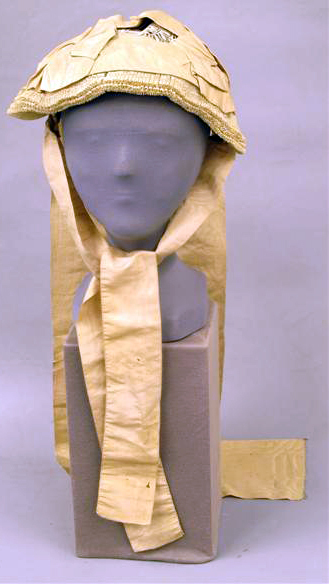 Bodem, drie geplooide voorstroken en luifke van witte tule. Bodem versierd met plumetis-borduurwerk. Beige moiré-zijden riblint over de muts geplooid en vastgespeld. Aan de achterzijde twee afhangende linten. Striklinten als boven, op halve breedte geknipt en met de naaimachine met zig-zagsteken afgewerkt. originele. Binnenkant bodem zwarte, hard gesteven tule. Rand van bodem verstevigd met ijzerdraad en stro.