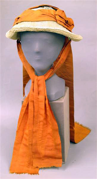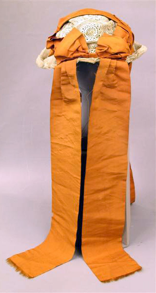 - BeschrijvingBodem, drie geplooide voorstroken en luifke van witte tule. Bodem versierd met plumetis-borduurwerk. Bruine rib-zijden linten over de muts geplooid en vastgespeld. Aan de achterzijde twee afhangende linten. Twee striklinten. Binnenkant bodem zwarte, hard gesteven tule. Rand van bodem verstevigd met ijzerdraad en stro.