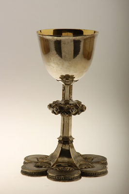 - BeschrijvingKelk met zeslobbige voet en met gegraveerd kruis. Nodus met bladachtige ornament en diamantvormige knoppen.