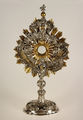 - BeschrijvingMonstrans in Lodewijk XV-de stijl met latere lunula met festonneerwerk en zonnestralen, waarboven God de Vader en de Heilige Geest.
