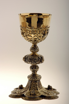 - BeschrijvingZeslobbige voet met gedreven afbeeldingen van geloof, hoop en liefde, afgewisseld met drie gegoten engelenkopjes. Op nodus en tegencuppa gedreven ranken met engelenkopjes.
