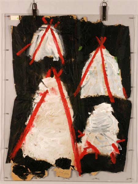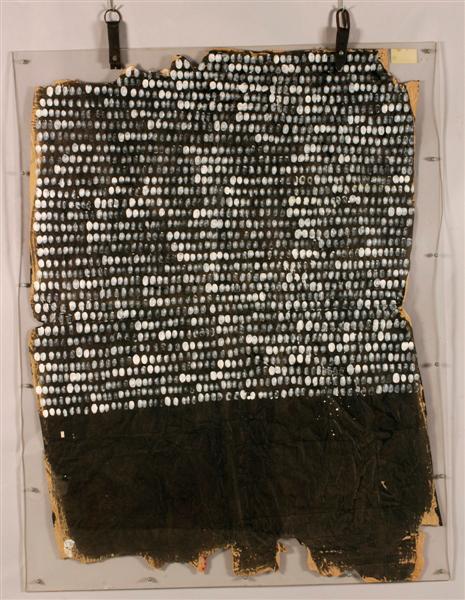 - Beschrijvingbeschilderde voederzak tussen twee plexiglazen platen met leren en/of metalen ophanglussen