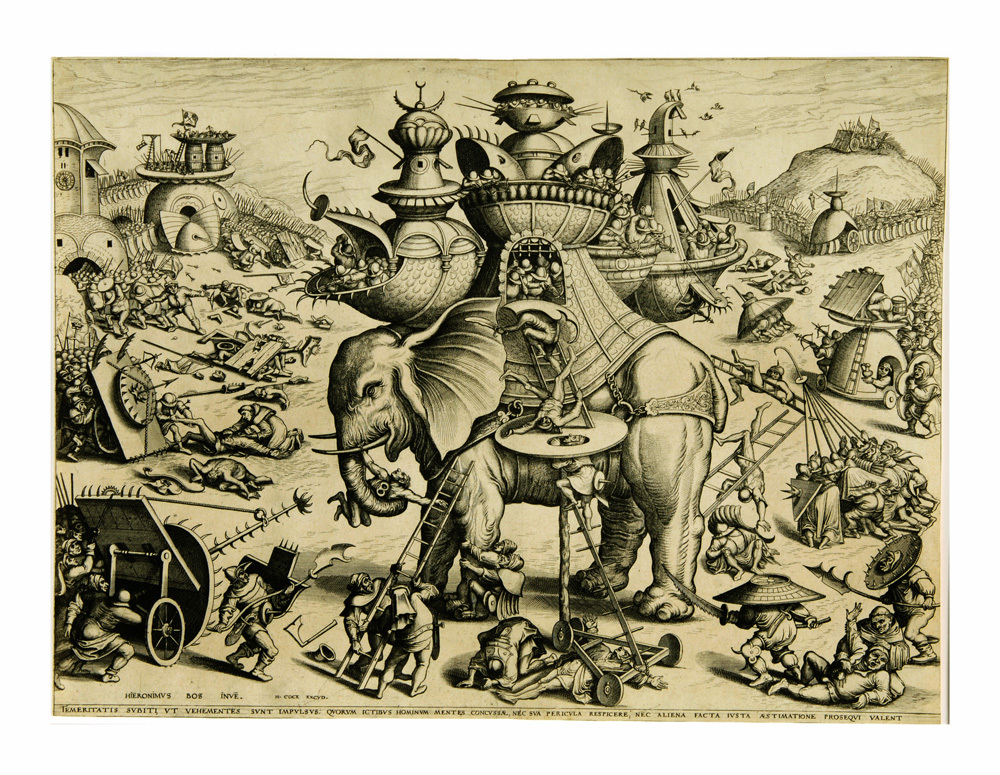 Temidden van een woelig krijgstoneel staat een olifant. Op zijn rug staat een fantastisch bouwwerk waarin zich soldaten hebben verschanst. Zij verdedigen zich tegen de aanvallers, die met ladders proberen de olifant te beklimmen. Rondom de olifant wordt overal gevochten door zwaar gepantserde krijgers. Het speelt zich af in een heuvelachtig landschap.